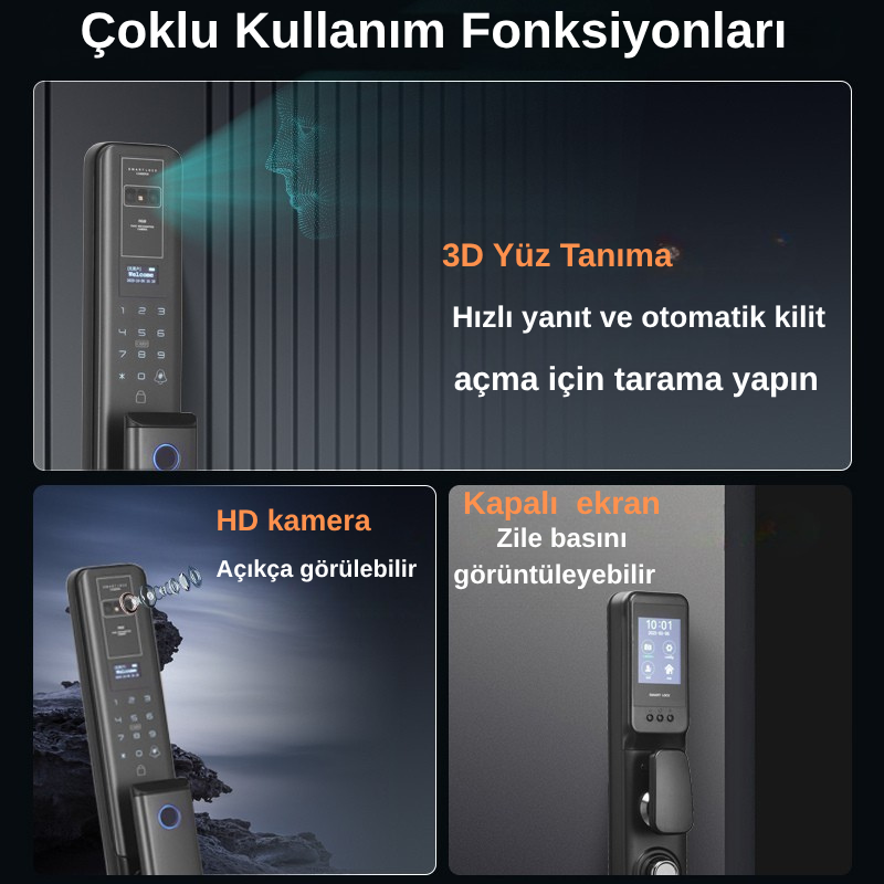 Anahtar taşıma zorunluluğunu ortadan kaldıran bu sistem, farklı giriş seçenekleri ile kullanıcıya maksimum konfor sunar. Yüz tanıma, parmak izi, şifre ve kart ile hızlı ve güvenli bir şekilde kapınızı açabilirsiniz.