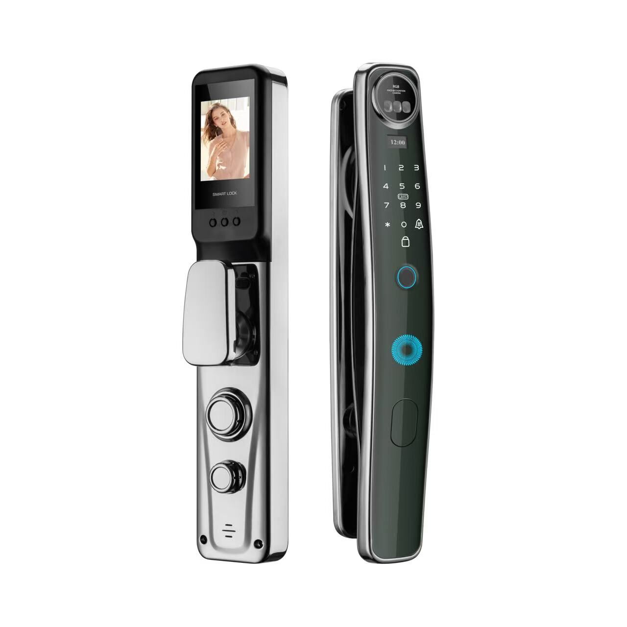 Tuya Uyumlu, Yüz tanıma Wifi Akıllı Kapı Kilidi; yüz tanıma, parmak izi, kart, şifre ve mekanik anahtarla açma seçenekleri sunan; aktif interkom özellikli; mevcuttaki kapı kilidini değiştirmeye gerek kalmadan doğrudan kurulabilen ve monoblok kilitlerle uyumlu, İngilizce menü ve seslendirmeli, 4200 mah bataryalı Wi-Fi kapı kilidi.